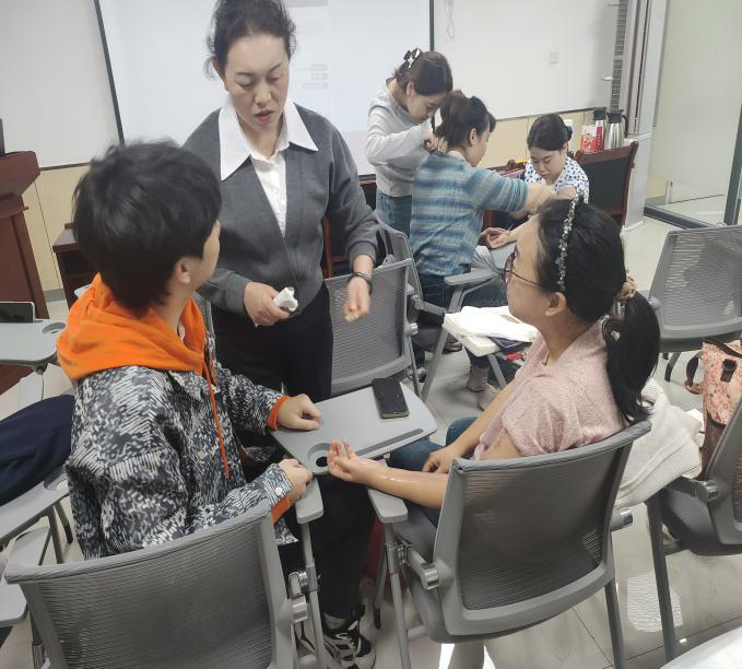 学员两两分组,相互进行练习。助教穿梭在学员中间,密切关注每个人的操作,及时纠正错误。有的学员握砭不正确、用力不均匀,助教老师会手把手教导如何握砭、如何控制力度;有的学员刮拭方向错误,助教便耐心讲解正确的经络走向与刮拭方向。现场气氛热烈,学员们积极交流,互相分享自己的感受与体验。这种“你反馈、我调整”的默契,比单纯刮痧手法更珍贵。