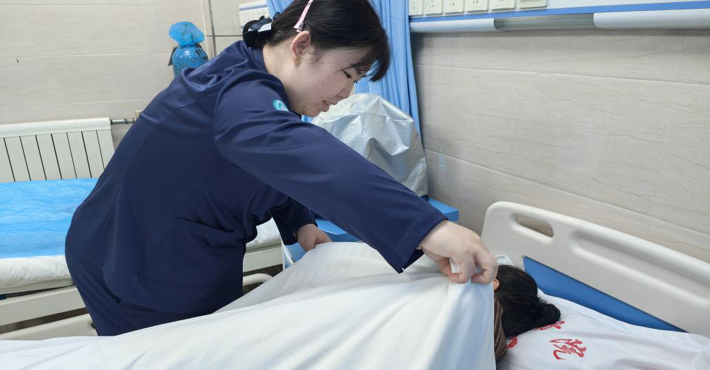 病房里,护士俯身,为卧床患者细心整理被角、抚平被褥。这一俯身的温柔,是超越诊疗的贴心照料,用细致入微的关怀,让每一位患者都能感受到被守护的安心与暖意。