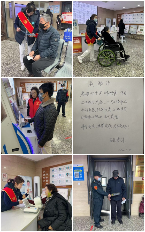 这样的场景,每天都在导诊台上演。有老人独自来院取药,腿脚不便走不动,导诊护士便帮着排队取药,还细心地将每种药的服用时间、剂量写在药盒上;有老人忘记带病历本,急得团团转,导诊护士一边安抚情绪,一边协助联系科室调取电子病历;还有老人做完检查后找不到出口,导诊护士便一路搀扶,将老人安全送到医院门口,目送老人坐上出租车才放心离开。志愿者的加入能有效缓解他们对智能设备的不熟悉和就诊流程的焦虑,让就医之路更顺畅、更温暖。