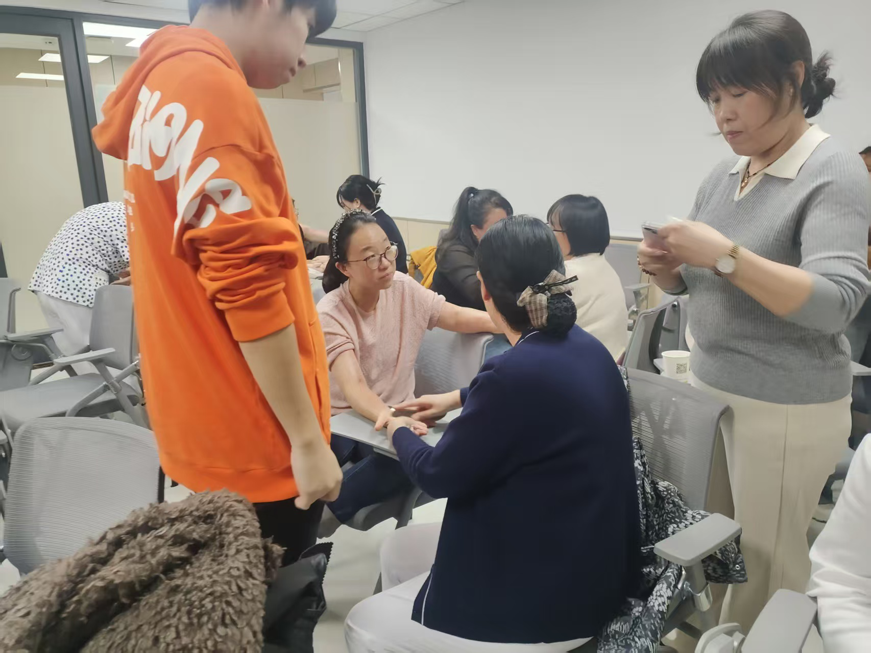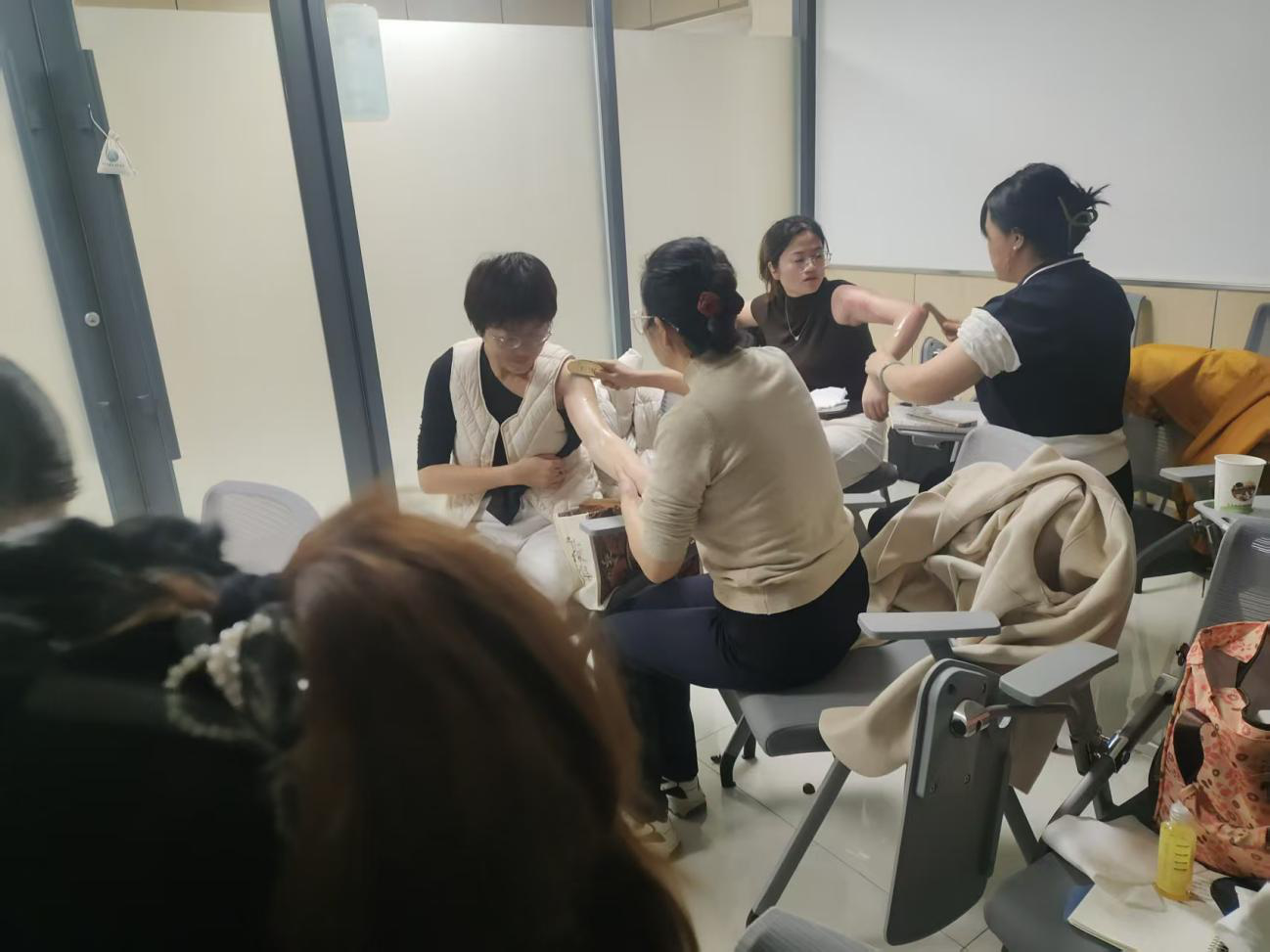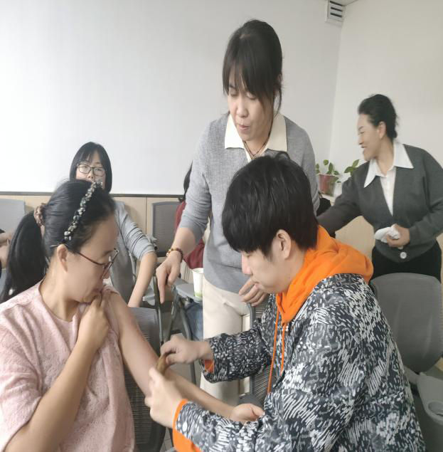 学员两两分组,相互进行练习。助教穿梭在学员中间,密切关注每个人的操作,及时纠正错误。有的学员握砭不正确、用力不均匀,助教老师会手把手教导如何握砭、如何控制力度;有的学员刮拭方向错误,助教便耐心讲解正确的经络走向与刮拭方向。现场气氛热烈,学员们积极交流,互相分享自己的感受与体验。这种“你反馈、我调整”的默契,比单纯刮痧手法更珍贵。